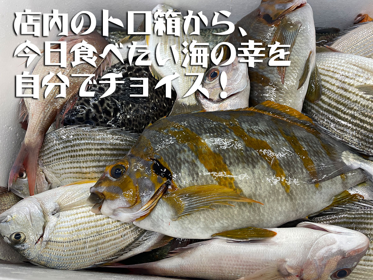 店内のトロ箱から新鮮な魚介を選んでいただき、刺身・焼き・煮付けなど、お好みに合わせて調理いたします。(食材は店内にある物なら何でもOK!伊勢海老、あわびはもちろん、貝類、干物類に至るまでお選び頂けます)